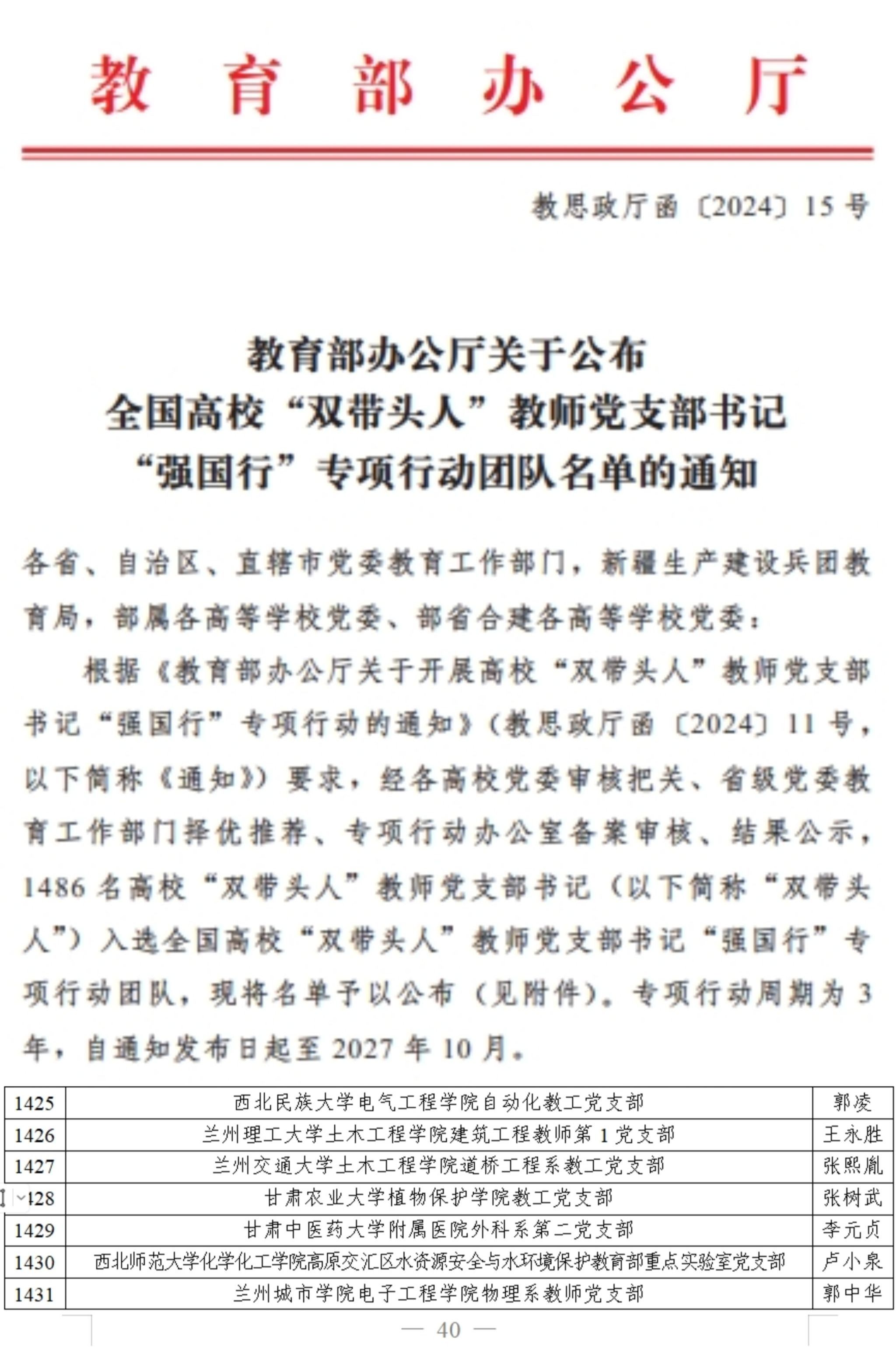 近日,教育部办公厅公布全国高校“双带头人”教师党支部书记“强国行”专项行动团队名单。学校电气工程学院自动化教工党支部成功入选。