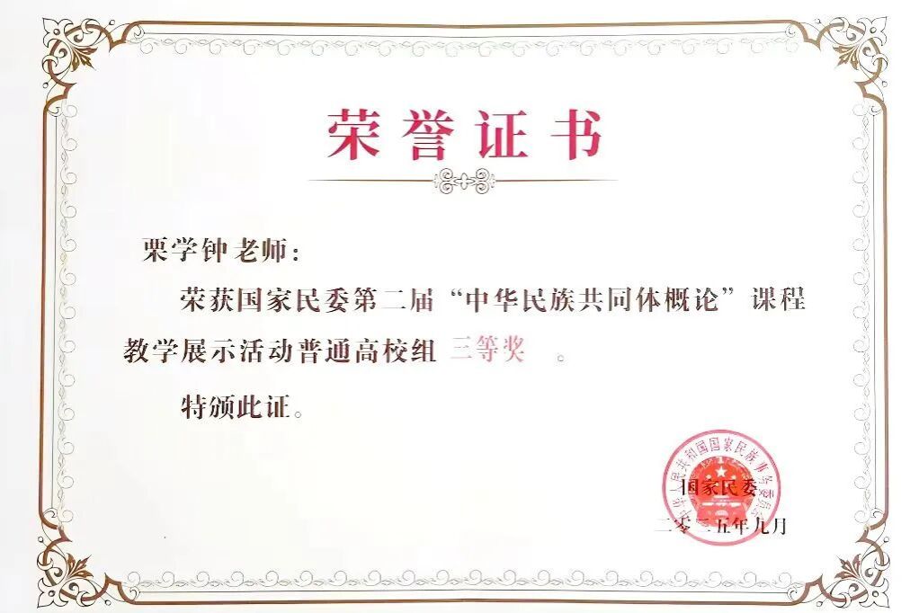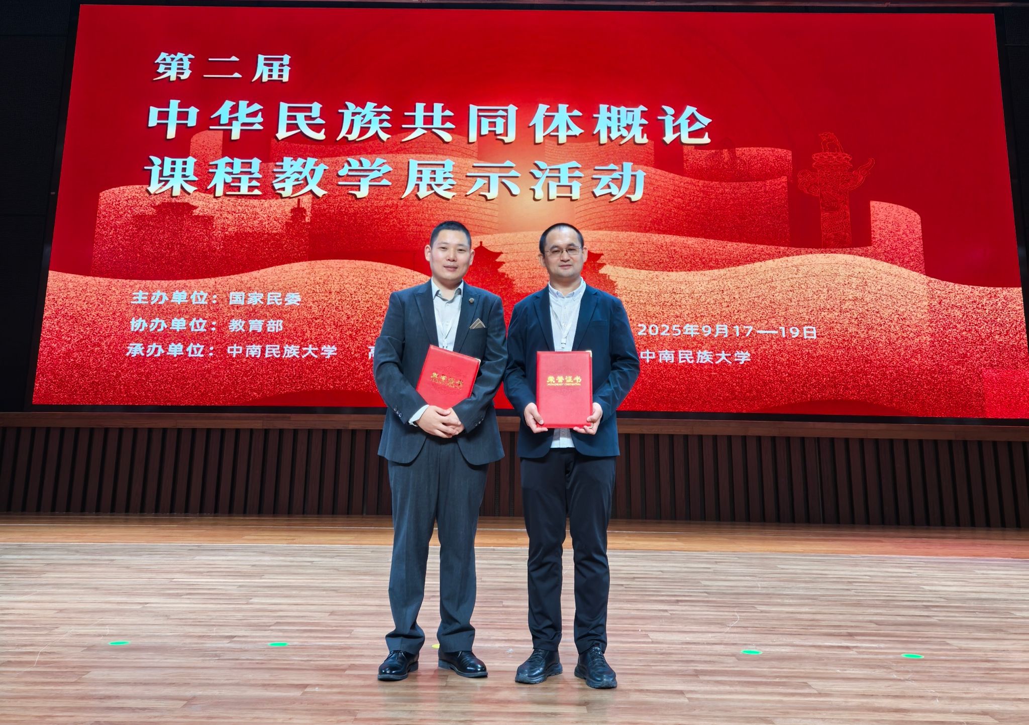 近日,国家民委第二届《中华民族共同体概论》课程教学展示活动在中南民族大学成功举办。经过激烈角逐,我校中华民族共同体学院教师王硕、栗学钟分别荣获普通高校组一等奖、三等奖。